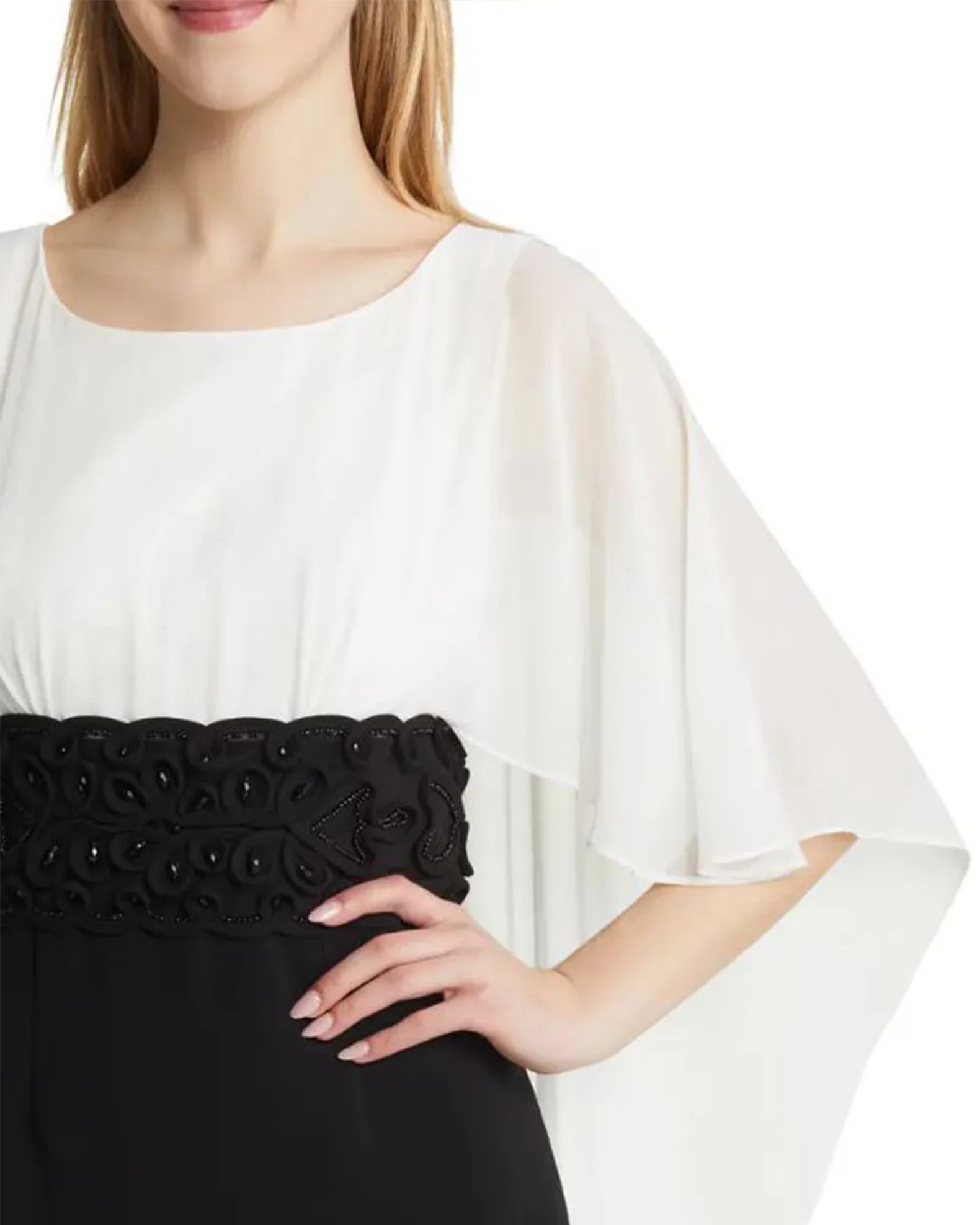 Soutache lace swirls at the waist of this night-out sheath designed with a flowy cape bodice.