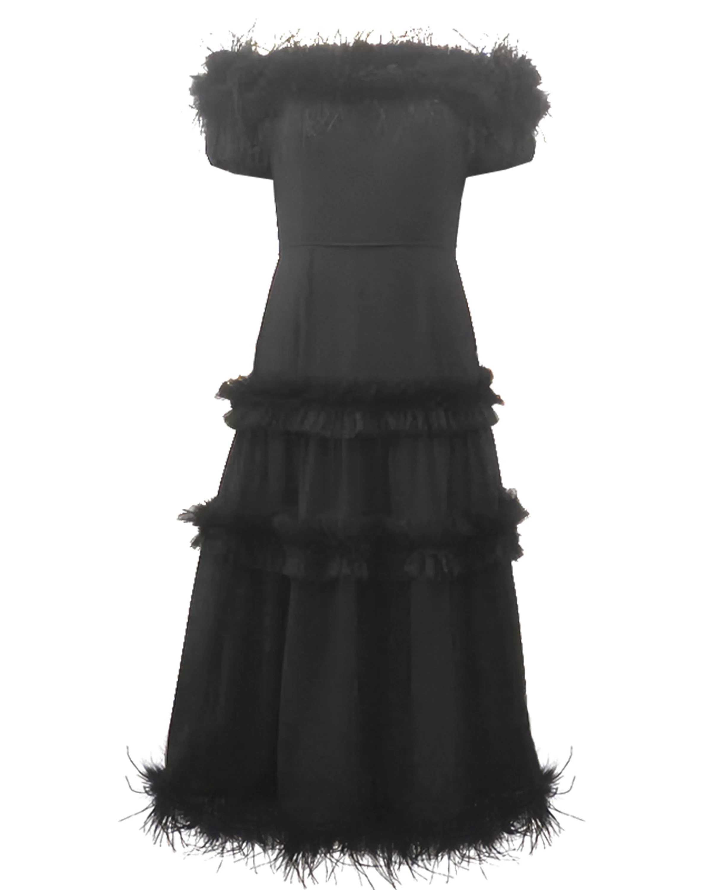 A fit and flare midi dress soars to the next level of drama with feathers and ruffles from top to bottom.