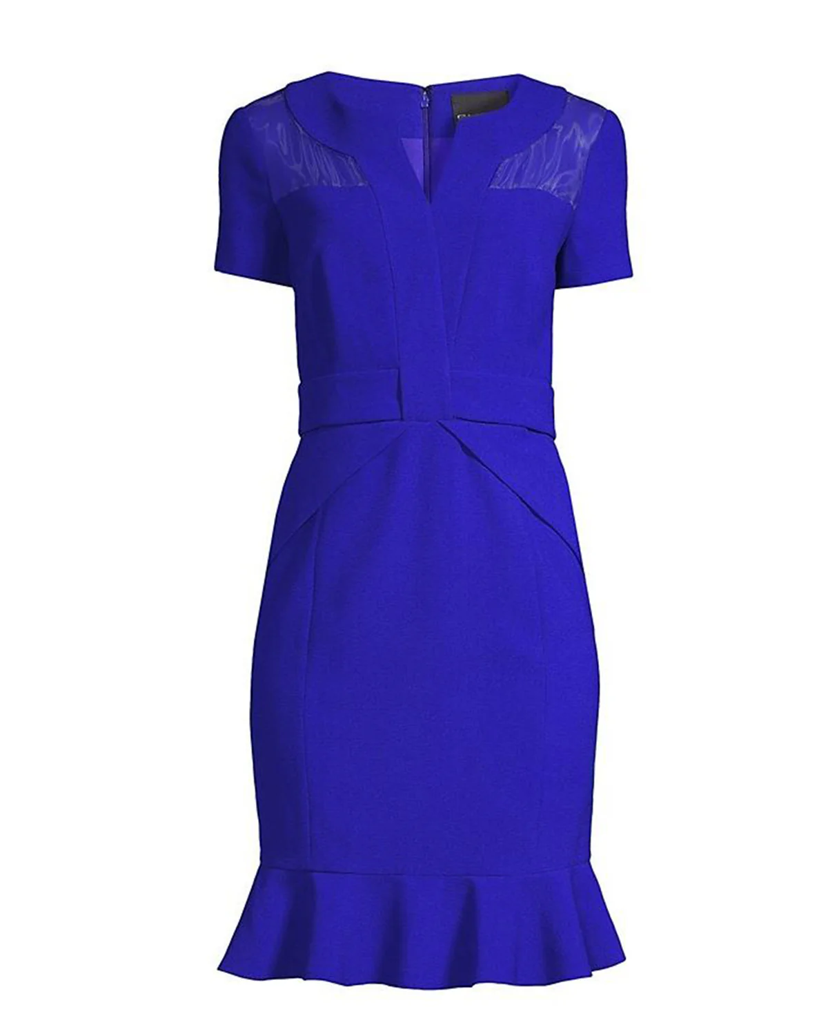 This sheath dress is crafted of structured crepe with a sheer silk organza yoke. A flounce hem finishes this knee-length style.