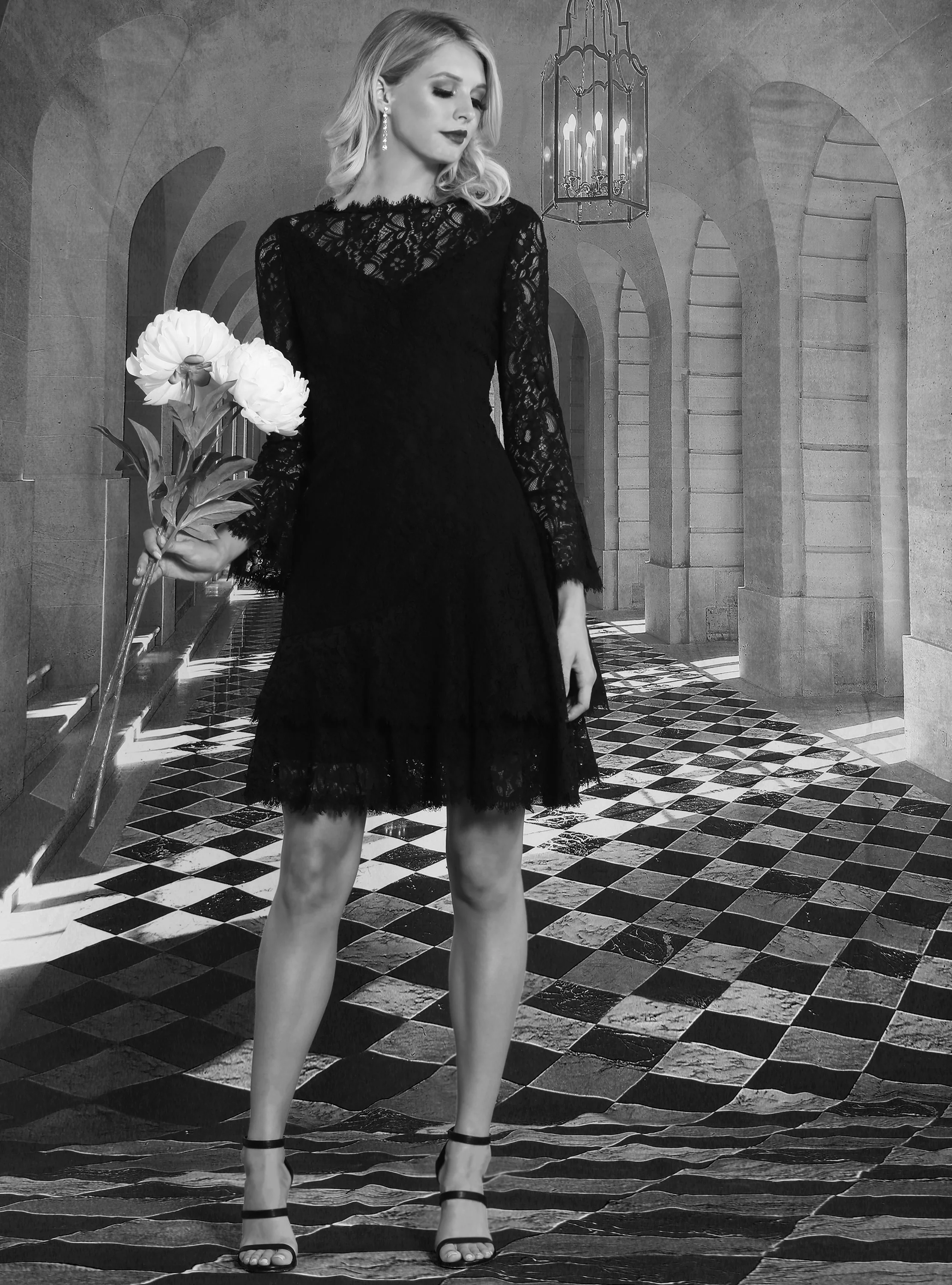 Classy lace dress with bell cuffs and double ruffled hem. This silhouette creates a glamorous shape, which will exude your confidence from within! The perfect party dress!