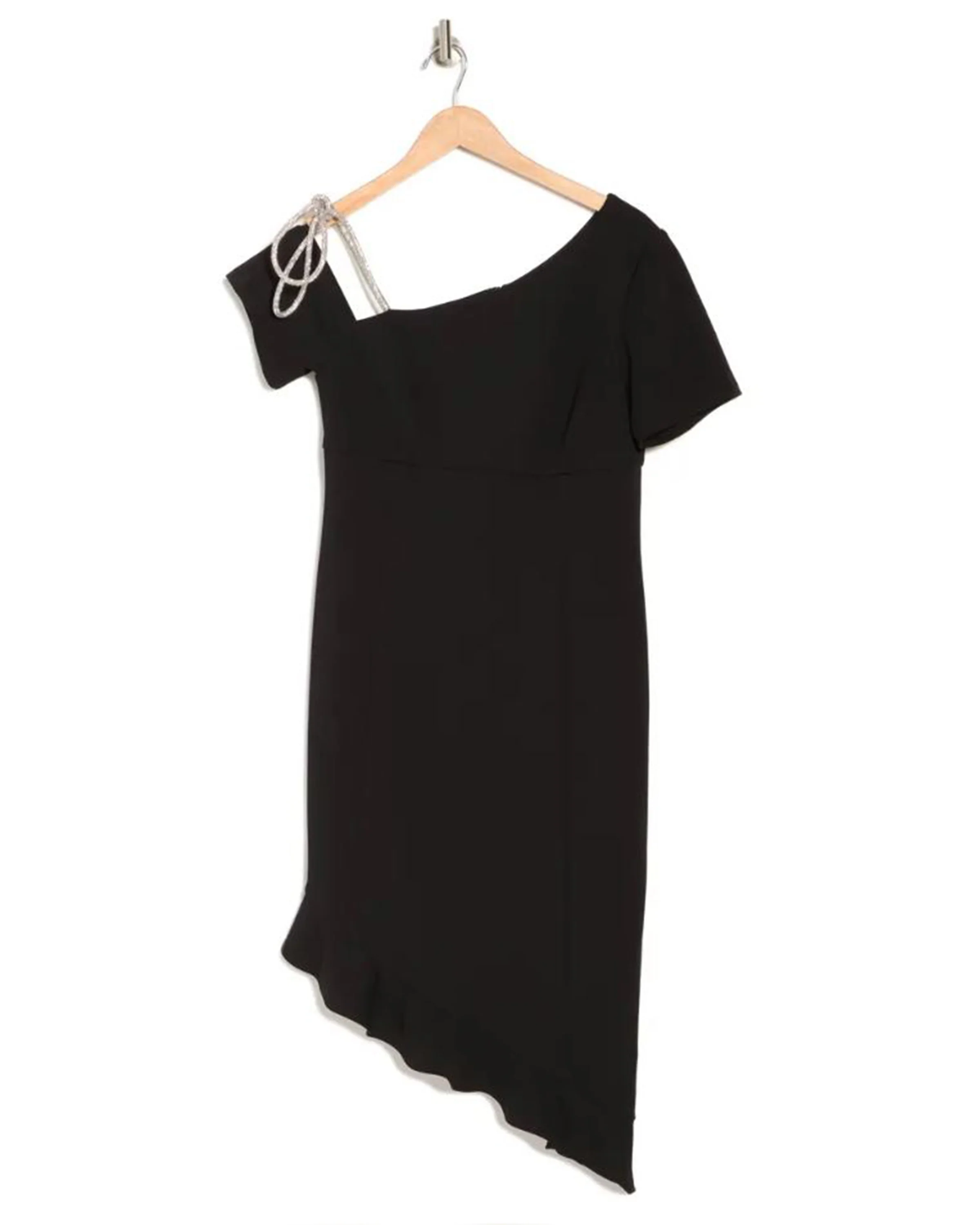 A singular, crystal embellished shoulder strap brightens this asymmetrical cocktail dress for a refined look.