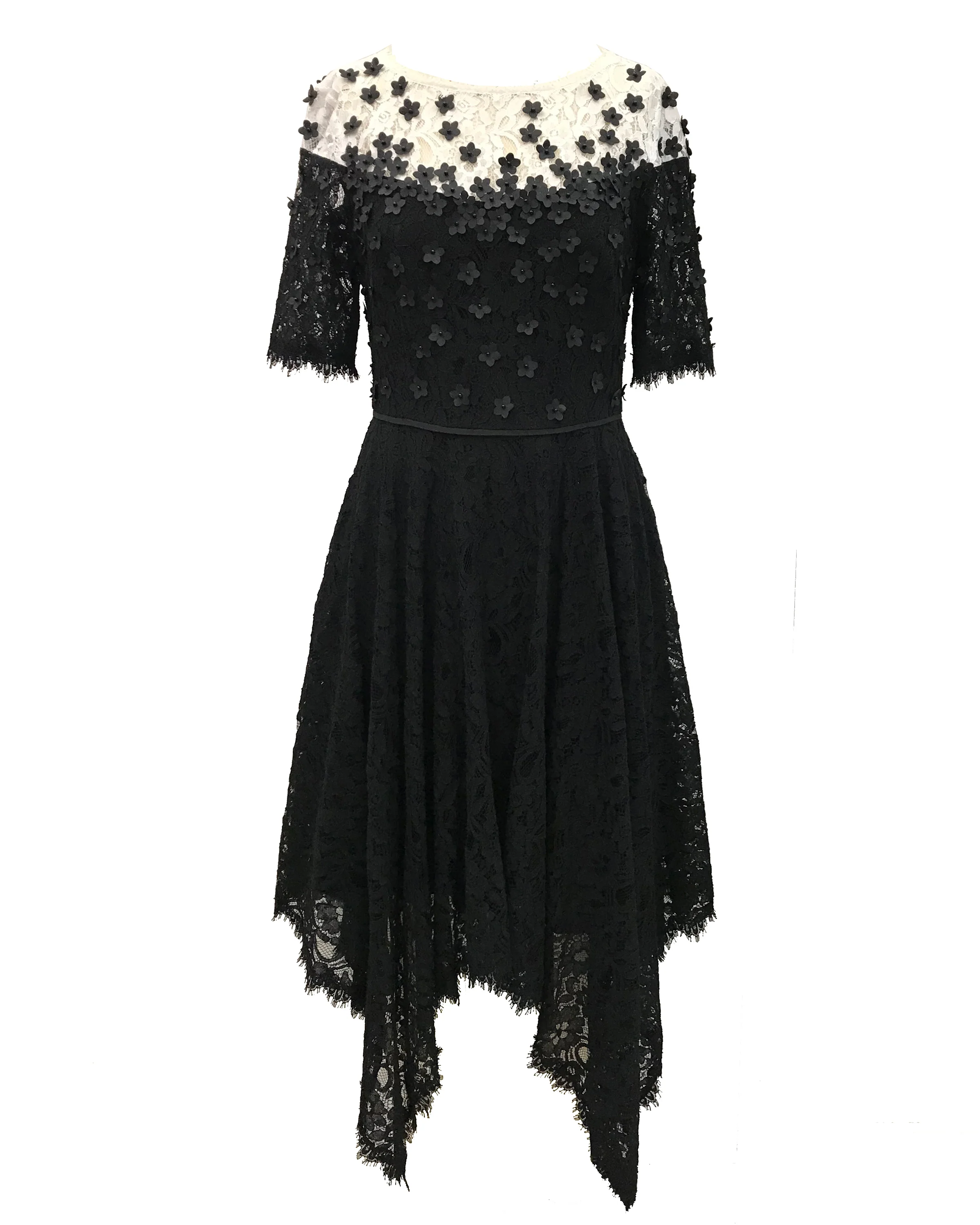 Easy fit and flare shape. Delicate floral applique on bodice and sleeves. Romantic hanky hemline to twirl and spin at your next party!