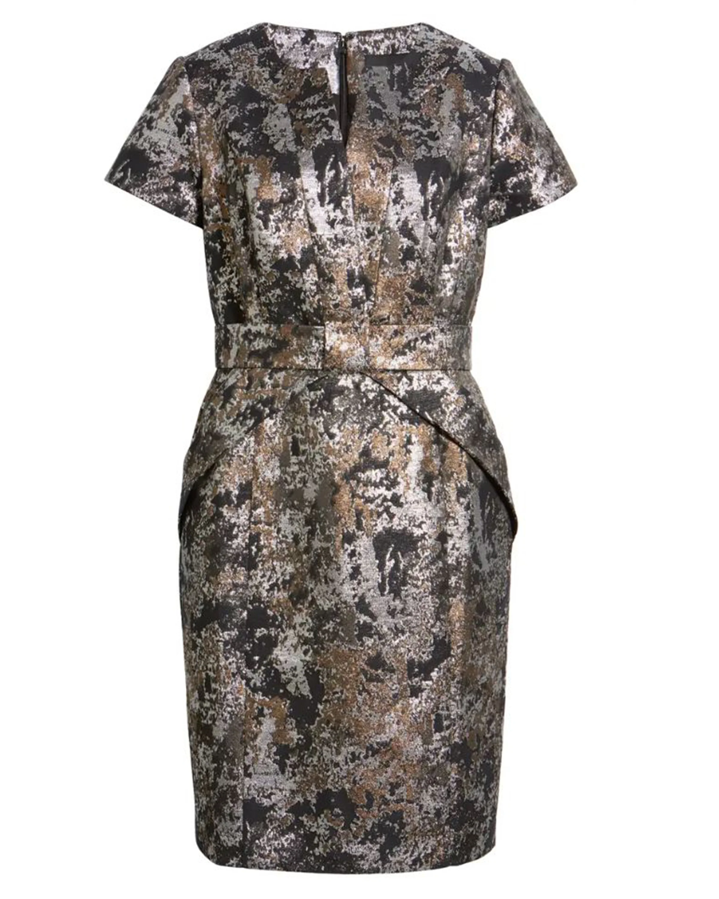 Add a bit of sophisticated shine to your next special event in this jacquard sheath dress featuring a subtle bow shape at the waist and a metallic finish.