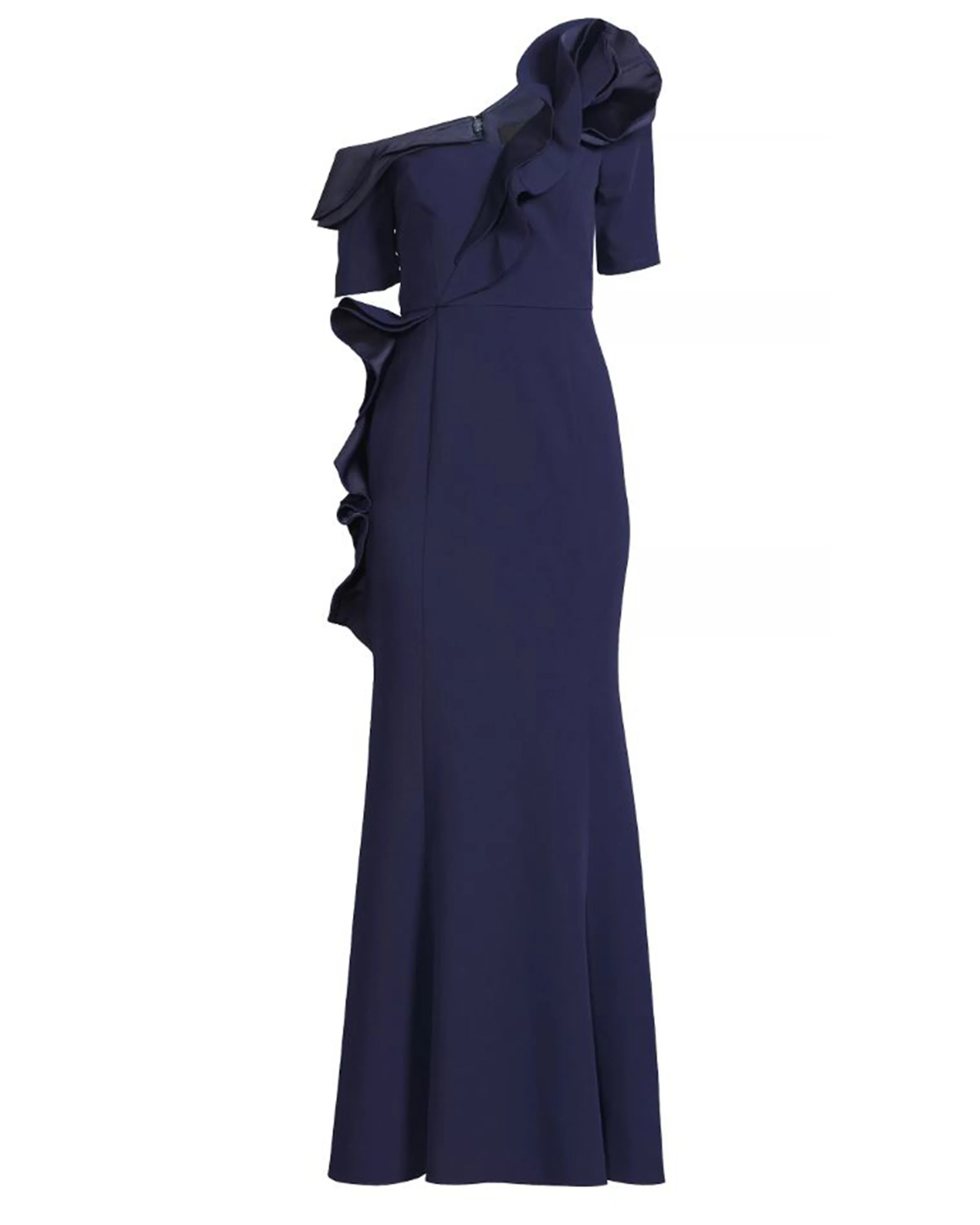 Crafted of crepe, this gown highlights a large 3D flower detail at the one-shoulder neckline. Command attention at your next big event in this beautiful gown.